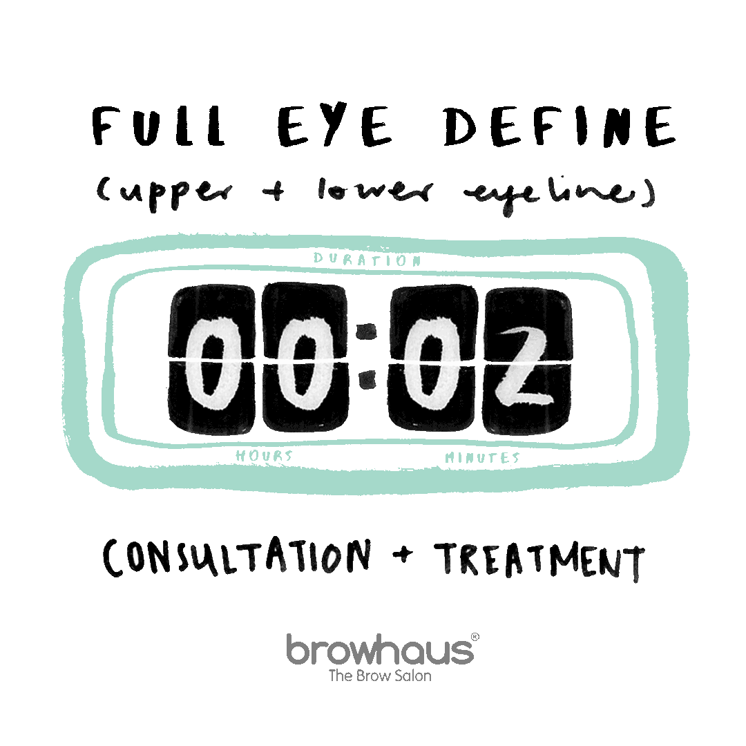 Full Eye Define for both upper and lower eyeliner takes 90 minutes to complete; the process consists of a consultation & the treatment.